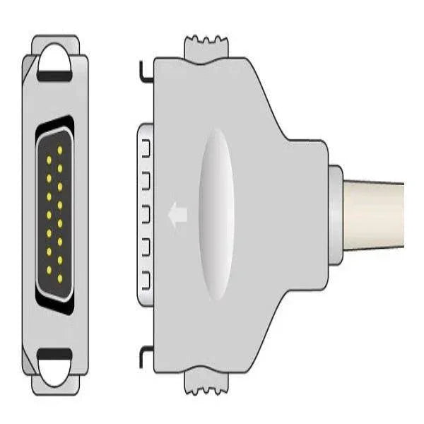 The 10-Lead Fukuda Denshi EKG Cable provides comprehensive connectivity for EKG monitoring, with a total length of 11 feet. It features 10 leads with needle connectors for secure attachment. The distal end is equipped with a DB-15 connector, while the proximal end has needle connectors.