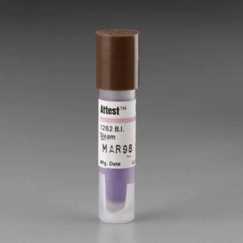 3M Attest Biological Indicator 1262 is designed for monitoring steam sterilization effectiveness, providing results within 48 hours. These self-contained indicators consist of a spore strip, sealed glass ampule with growth medium and bromocresol purple pH indicator system, brown color-coded cap with sterilant penetration holes and a filter, and a process indicator on the label. After sterilization, the vial is crushed to combine the growth media with the spore strip. Incubation for 48 hours reveals a visual change readout. A yellow color change indicates surviving spores and a positive result.