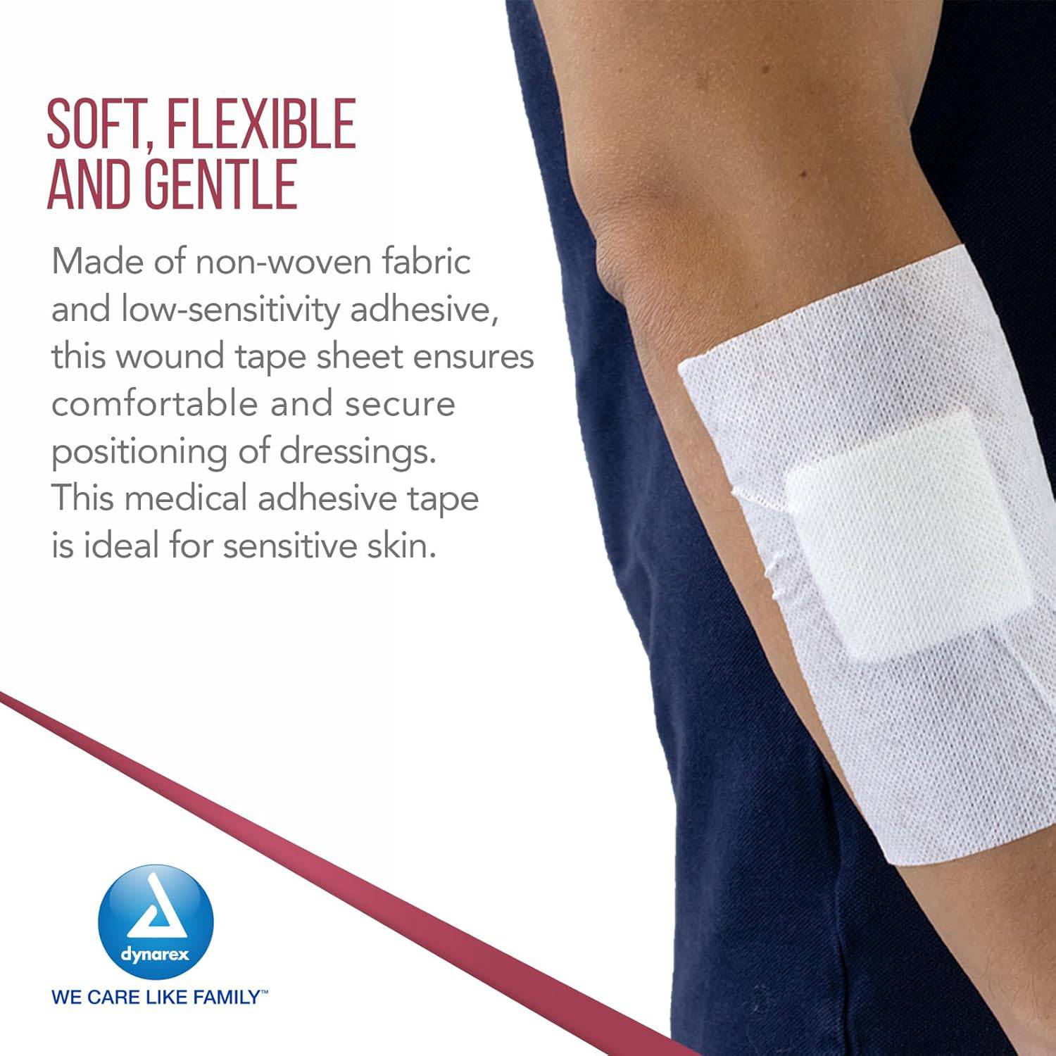 Dynarex Dressing Retention Sheets provide secure and comfortable dressing fixation. The low-sensitivity adhesive tape is made of soft and flexible non-woven fabric, ideal for securing dressings and appliances.
