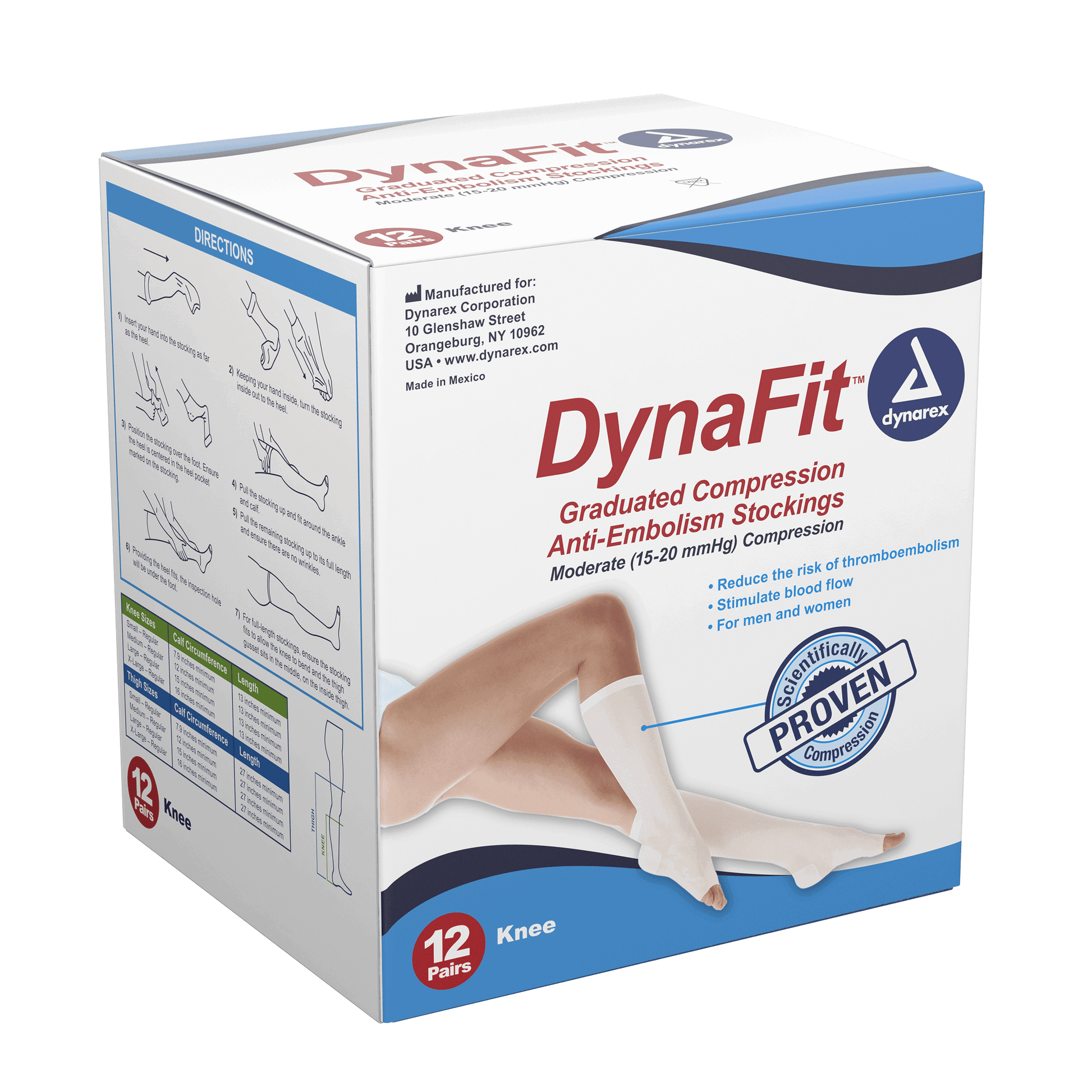 Dynarex offers these anti-embolism compression stockings in both knee-high and thigh-high styles, with sizes ranging from S to XL. Each box contains 12 pairs of disposable stockings.