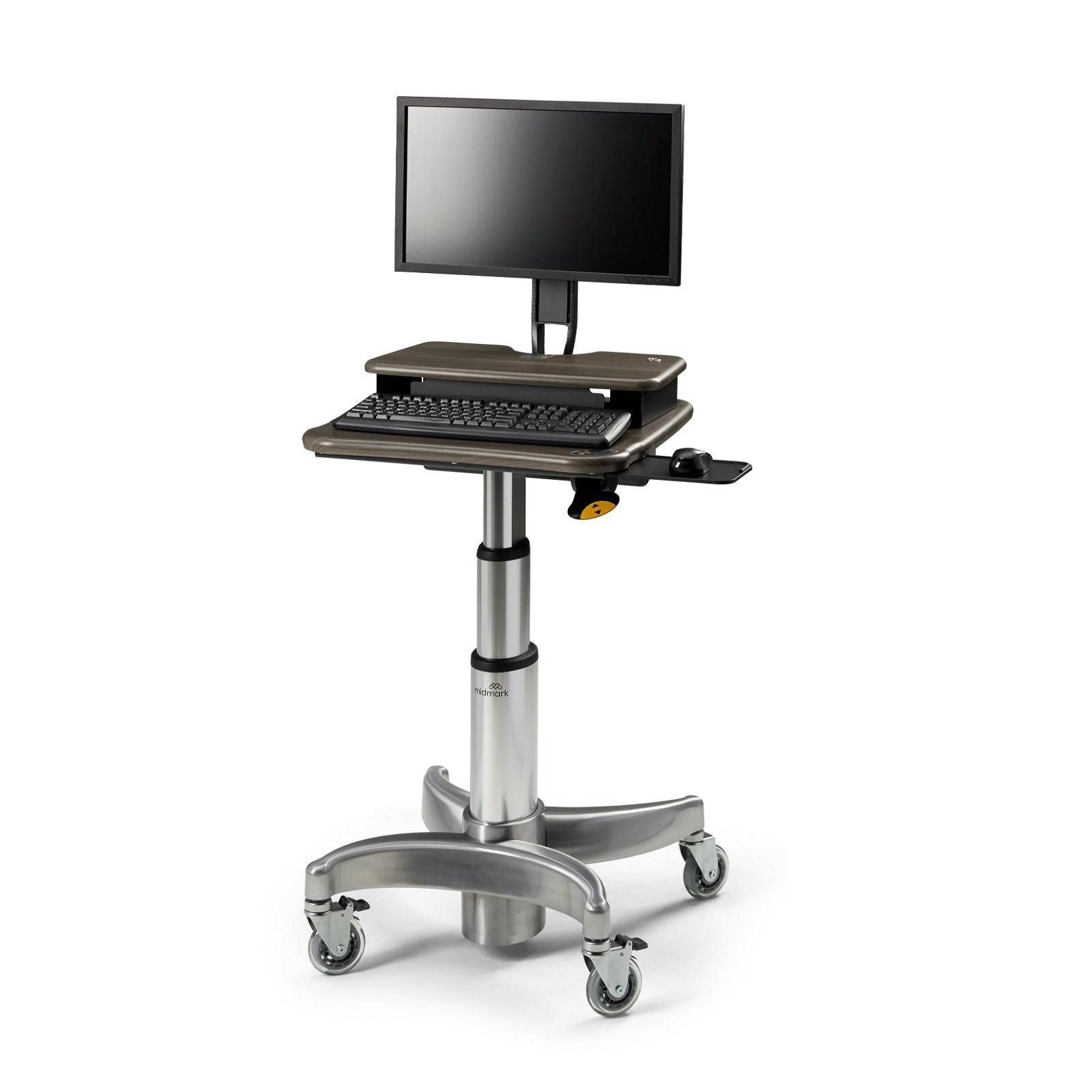 With 26 inches of height adjustment, ranging from 23 inches to 49 inches, it ensures ergonomic comfort for healthcare professionals of varying heights. Equipped with a keyed security system, a mouse surface on both sides, and a secondary work shelf, this workstation enhances workflow flexibility and organization.