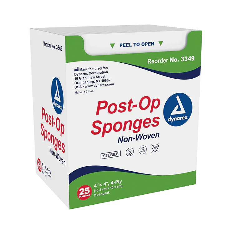 Elevate post-operative care with Dynarex Post-Op Sponges, offering superior absorption and improved wicking with non-woven materials. Packaged in user-friendly peel-down pouches, these sponges ensure easy and aseptic handling.
