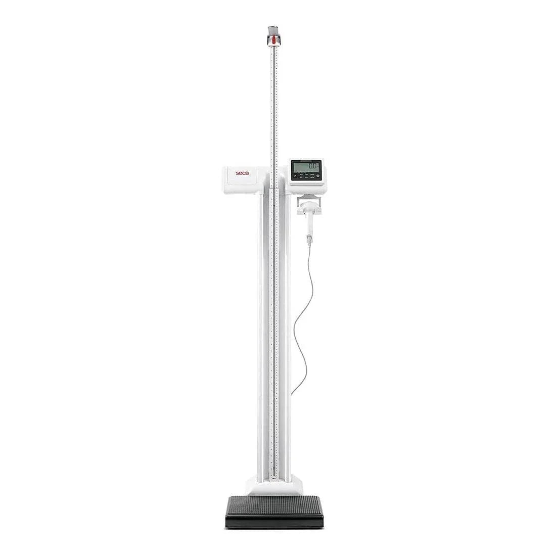 The Seca 787 is a robust medical-grade scale designed for high-volume patient use, ensuring reliable performance over years of service. It features an integrated digital measuring rod for precise height measurement across a wide range. The scale boasts a high-resolution two-line LCD display showing height, weight, and BMI, making it ideal for clinical settings.